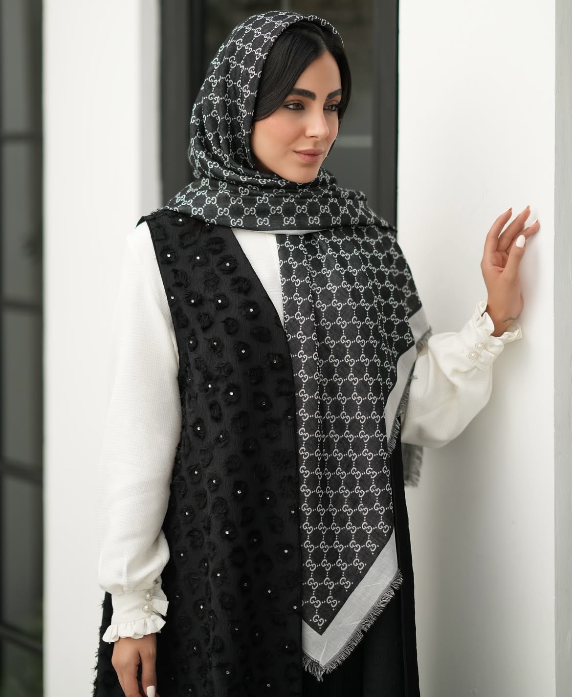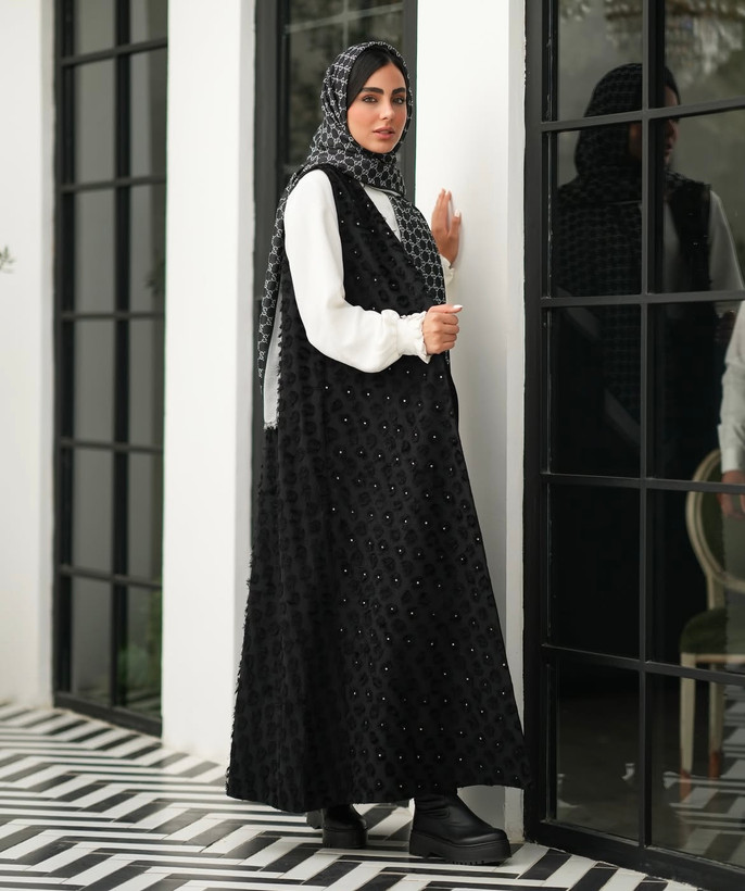 - تزئین: نگینهای ریز و باکیفیت که بهصورت پراکنده و ظریف روی پارچه کار شده