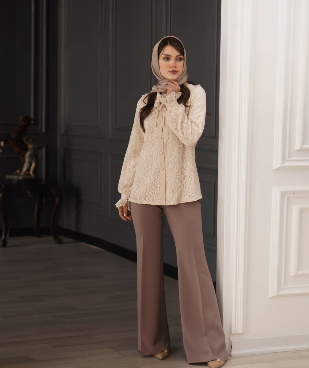 این شومیز از پارچهی دانتل درجه یک دوخته شده که بافتی لطیف، سبک و تنخور بسیار شیکی دارد. آستینها نیز از همین دانتل ظریف طراحی شدهاند که حالتی نیمهشفاف و مجلسی به لباس میدهد